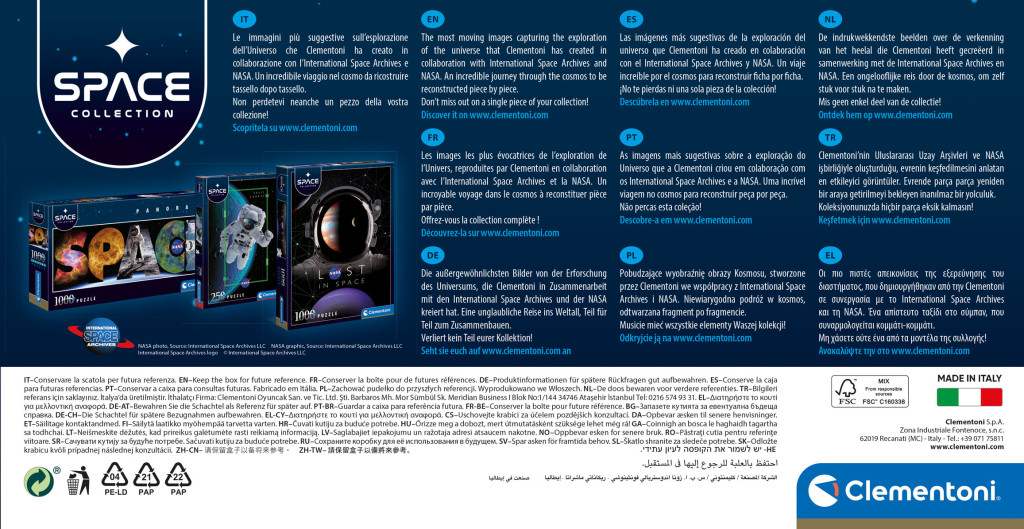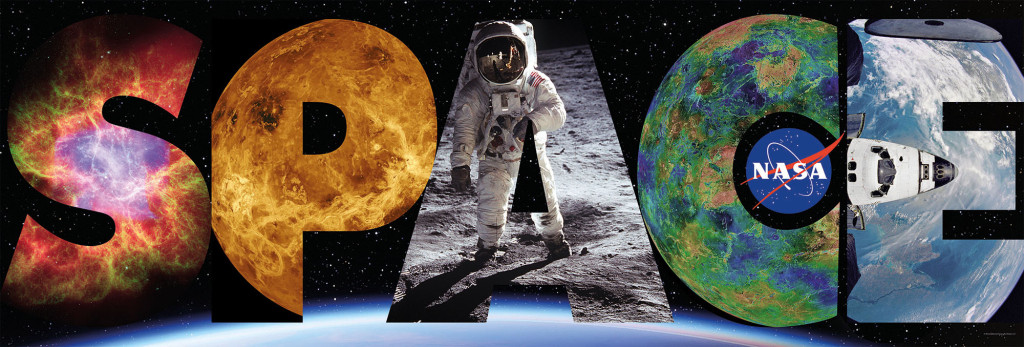 Az óriási panoráma puzzle egy látványos SPACE felirattá rakható ki, melyen egy asztronauta, a NASA logo és különböző bolygók is láthatók.
