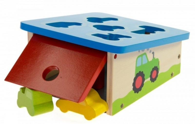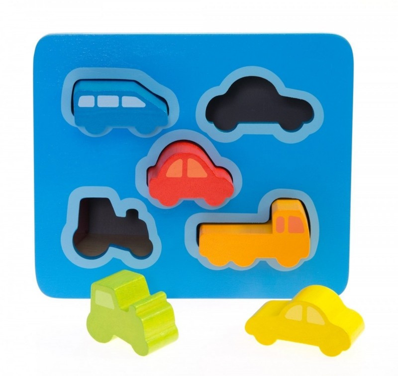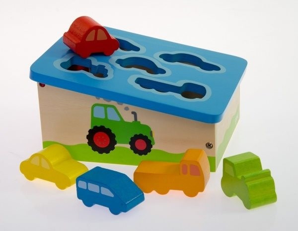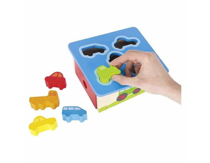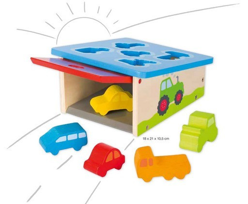Az autós formagarázsba öt különböző formájú és színű autót tudnak a kicsik helyezni a formáknak megfelelően. A játék hozzájárul a szín és forma felismerés fejlesztéséhez. Játék közben fejlődik a gyerekek finommotorikája és szem- kéz koordinációja.