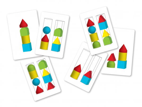 A doboz feladatkártyákat is tartalmaz, amin különböző helyzetekben láthatóak a formák.