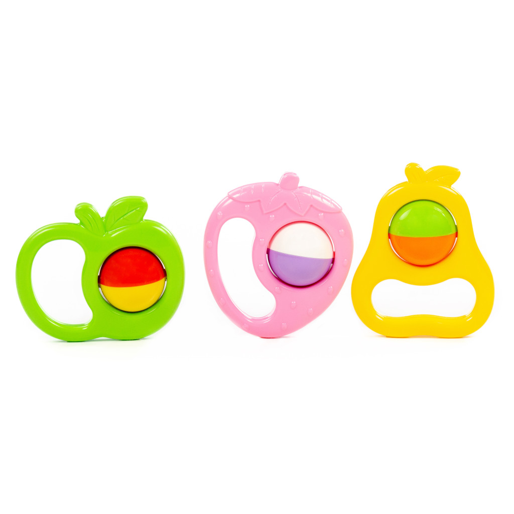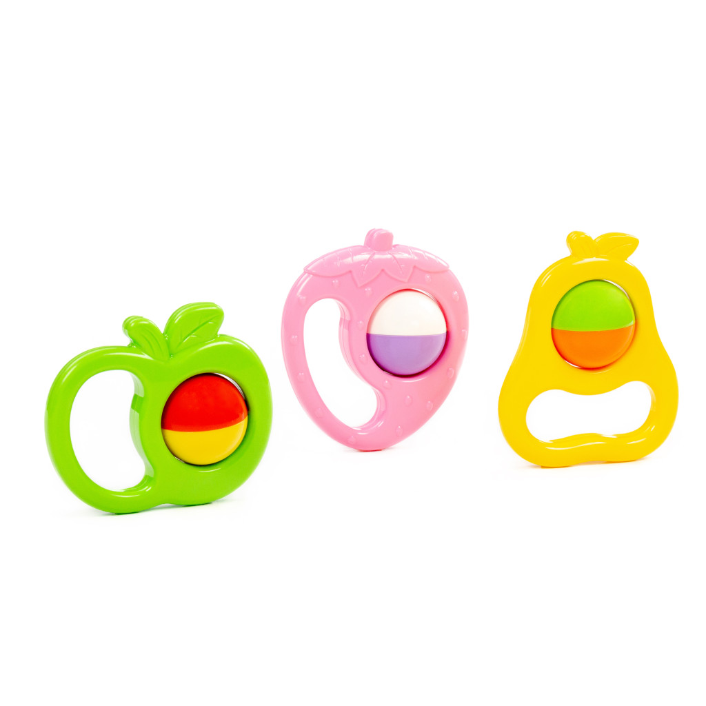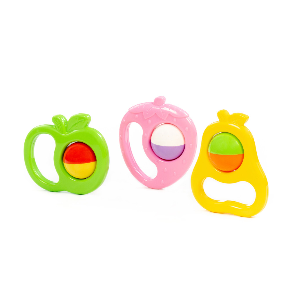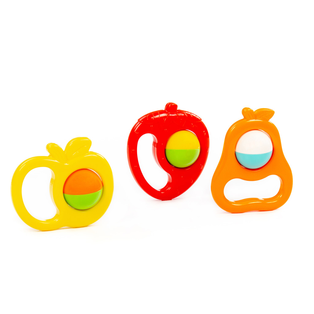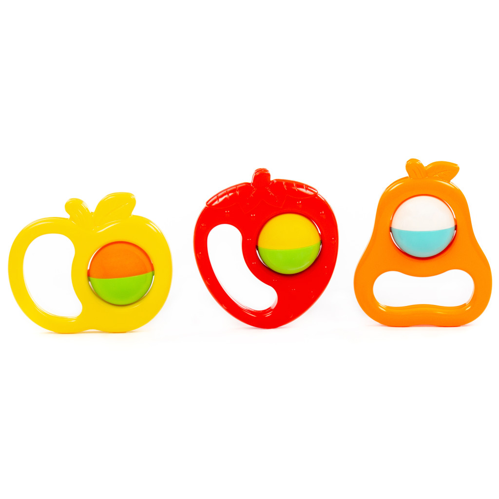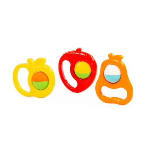 Ez a biztonságos és tartós műanyagból készült készlet három különböző gyümölcs alakú csörgőt tartalmaz, amelyek könnyen megfoghatók és rázhatók. Élénk színeivel, kellemes hangjával és kényelmes fogásával is segíti, ösztönzi a babák mozgását, hallását és tapintását.