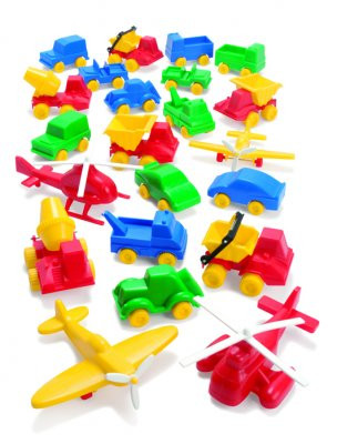 22 db 8-16 cm-es jármű (betonkeverő, helikopter, repülő, kisautó, teherautó, vontatóautó, konténerszállító) 4 színben.