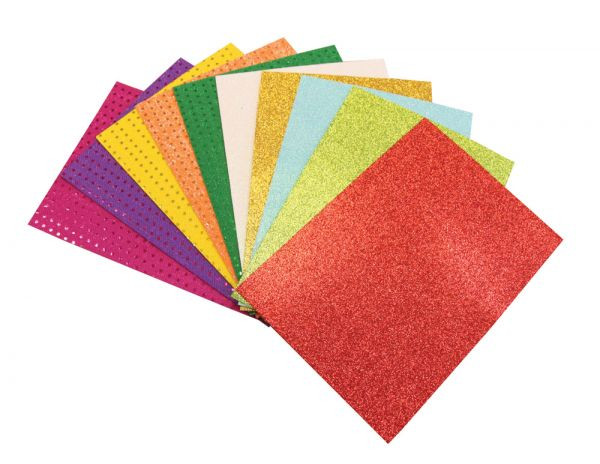 10 darabos csillgós dekorgumi lapok szett. A/4-es méretben vegyes színekben. Könnyen vágható és ragasztható.