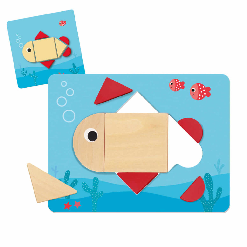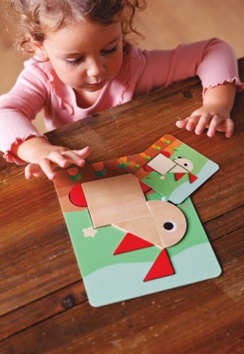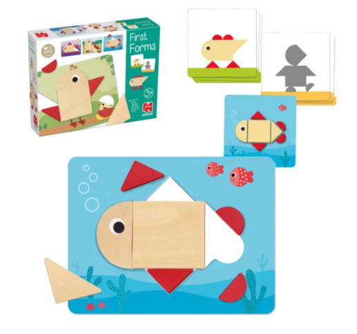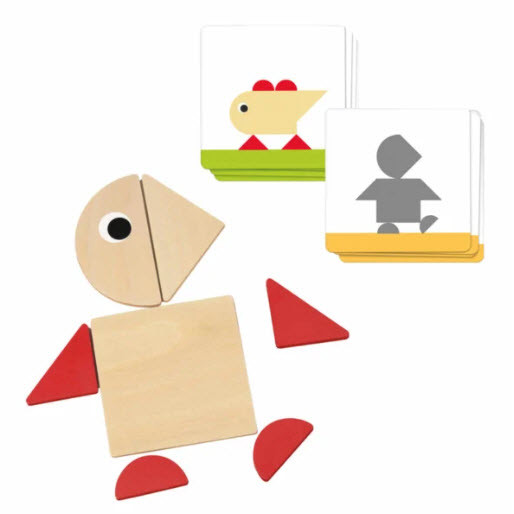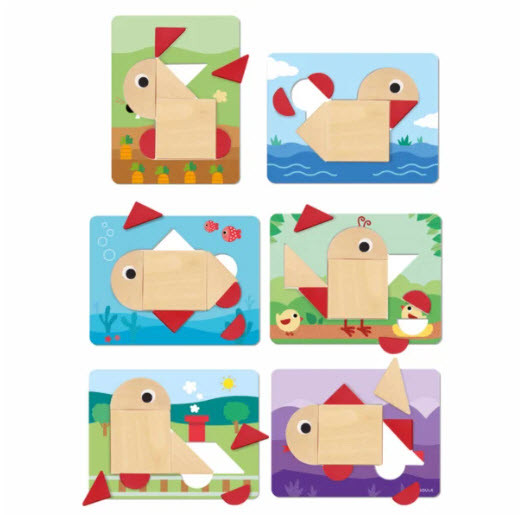 A készlethez 7 db, fából készült geometriai forma is tartozik. Az alaplapokba a geometriai formák behelyezésével különböző állatok rakhatók ki. A formák beillesztését segíti, hogy az alaplapon a kivájt helyhez kell megtalálni a megfelelő formát.