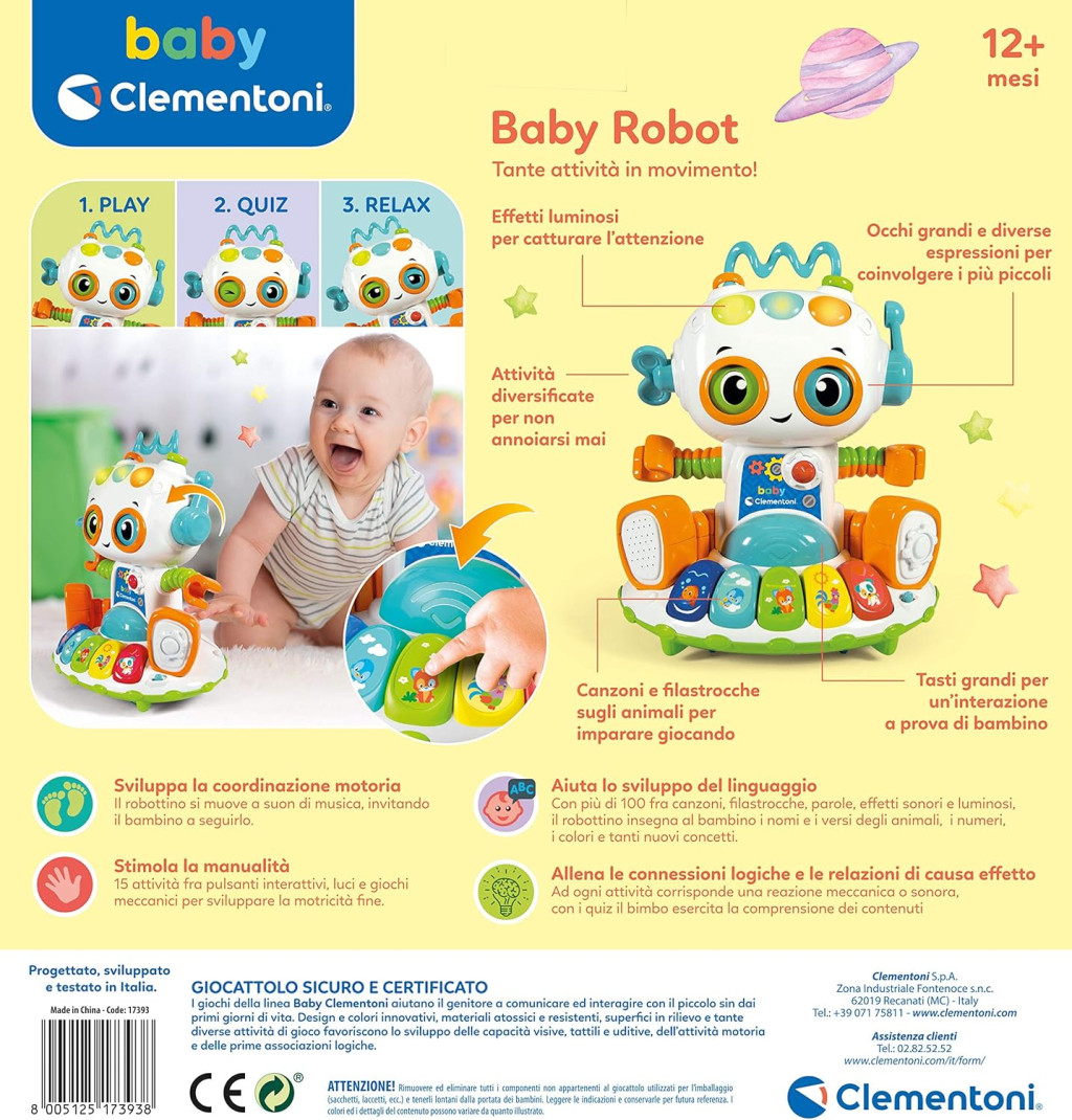 Az oktatási és kvíz módban a Clementoni Baby Robot mozgásba lendül, dallamokat és vidám dalokat játszik, hogy felkeltse a gyerekeket figyelmét. Többek között 3 funkcióval rendelkezik: