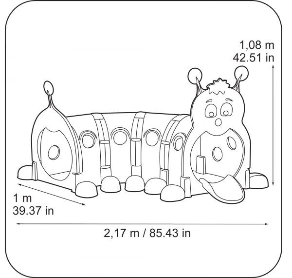 Nagymozgást fejlesztő kültéren- és beltéren is használható játszóeszköz. A kétoldalt elhelyezett 5 pár színes tappancs növeli a stabilitást. Az oldalelemeken kialakított lyukak elősegítik a mászást, szellőzést, kapaszkodást, a kezdő és végelemeken kialakított fülecskék és a farkinca a kicsik biztonságérzetét növelik. A kezdőelem alján lévő nyelvecske a könnyebb és kényelmesebb kibújást segíti elő.