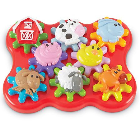 A Learning Resources farm forgató játéka 1 db 28x20 cm-es alaptáblát, 8 db 9 cm-es fogaskereket és 8 db vidám farm figurát tartalmaz.