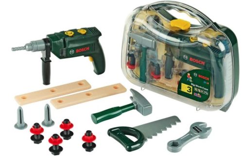 A picike szerszámos táska és fúrógép Bosch logóval ellátott, sötétzöld színű. A külsejének köszönhetőn teljesen élethű, pont olyan, mint a felnőtteké.