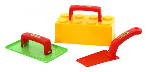 Három részes homokozó készlet, vegyes színekben. A készlet egy zöld színű simítót, egy piros színű kőműveskanalat, illetve egy sárga színű homokozó formát tartalmaz, mely a népszerű dán építőkockák formá