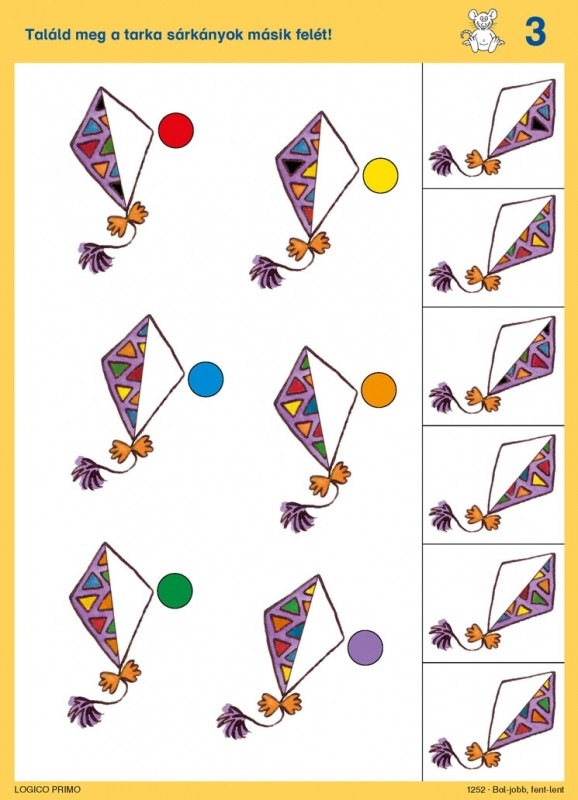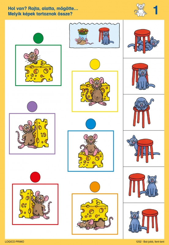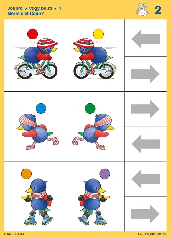 Tartalma: 16 db feladatkártya, a hátoldalán a megoldásokkal A Bal-jobb, fent-lent az alábbi témákat dolgozza fel: Térbeli irányok, a képeken látható tárgyak és kedves állatfigura szereplők egymáshoz való pozíciójának felismerése. Térbeli tájékozódás Logikai kapcsolatok Párosító feladatok Tükörkép A Logico Primo feladatkártyák csak a Logico Primo kerettel együtt használhatóak! A termék mérete: 17x23 cm