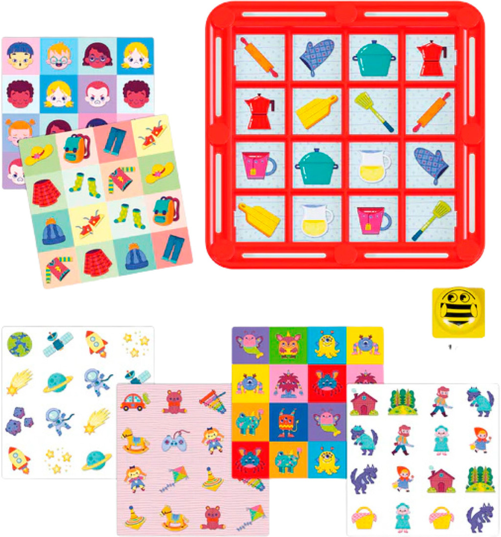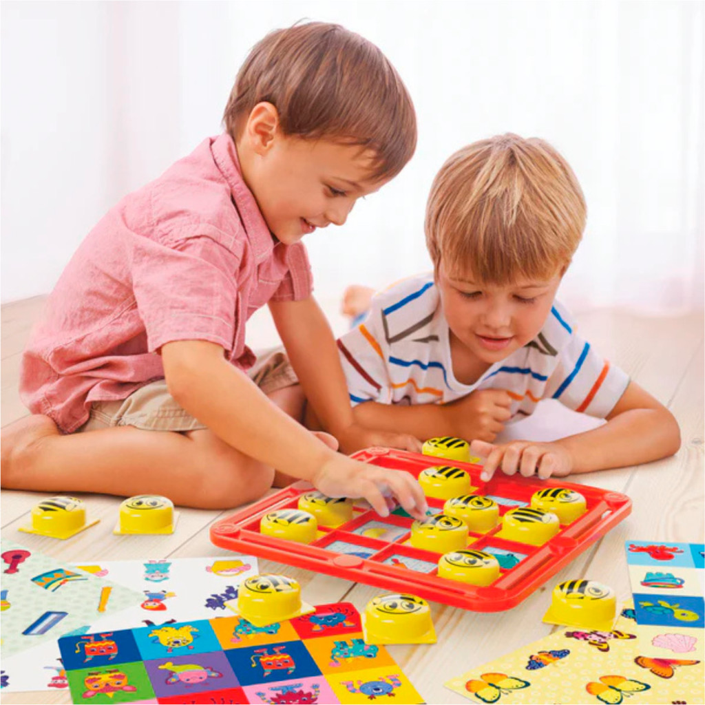 Szórakoztató fejlesztő játék, amely segít a gyermekek figyelmének és memóriájának javításában. - Méhecskés memória játékszett. A készlet tartalma: - -1 db piros játékkeret - -16 db sárga méhecske - -12 db különböző témájú kártya. anyaga: papír, műanyag