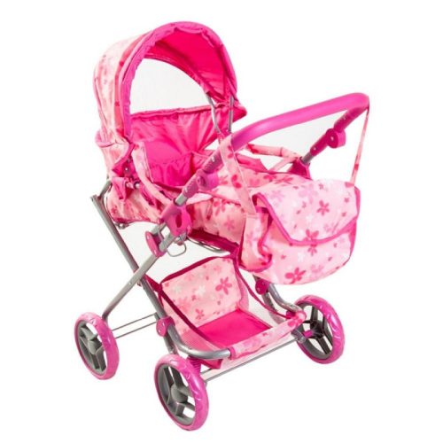 Nagy, játékbabakocsi táskával, virágos mintával.