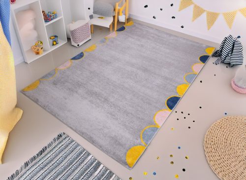 Kellemes, szürke alapszínű szőnyeg, melynek két szélén különböző színű félkörök helyezkednek el a következő színekben váltakozva: baba kék, pasztell rózsaszín, sötét kék, narancssárga.