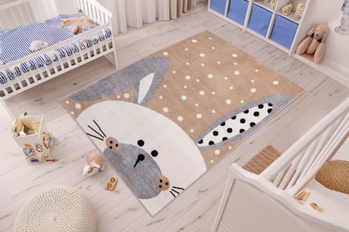 Kellemes, bézs alapszínű szőnyeg, mely tele van fehér pöttyökkel, a szőnyeg közepén pedig egy kedves kis kajla nyuszi található.