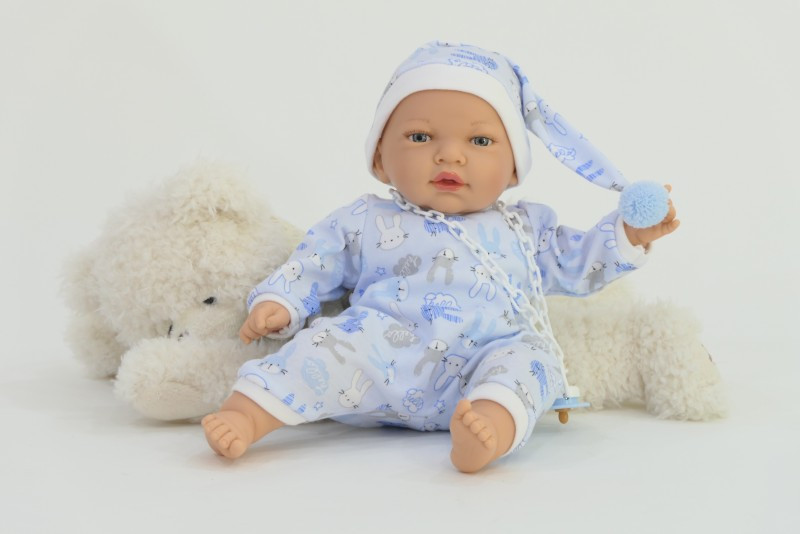 Peti babának a kék ruháját vidám minták díszítik. A szettet a ruhához színben illő hálósapka egészíti ki.