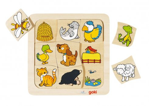 A Goki párosítós, puzzle kirakója teljes mértékben fából készült, egészségre káros anyagokat nem tartalmaz. A fatáblás kirakón ismert állatok láthatók, mint például a madárka, kutya, méhecske, cica, fóka, béka, bárány, kacsa és a vakond. Mind a 9 állat kü
