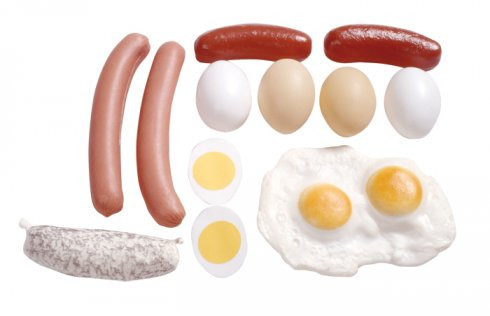 2 db sült kolbász, 2 db virsli, 1 db dupla tükörtojás, 2 db nyers tojás, 2 db főtt tojás, 2 db fél főtt tojás