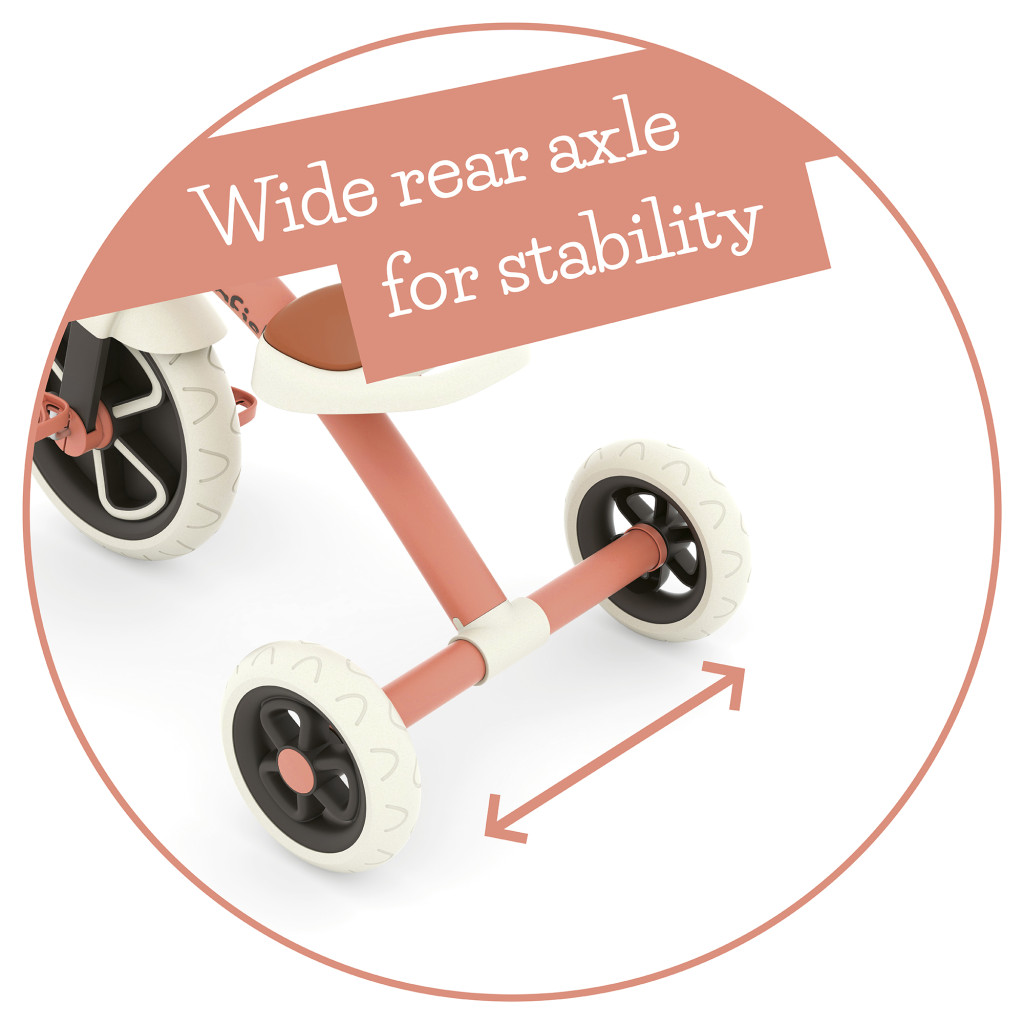A pedálos meghajtás támogatja a nagymozgások fejlődését, a kényelmes habszivacs ülés pedig beépített hordozófogantyúval rendelkezik és megfelelő stabilitást biztosít a legkisebbek számára is.