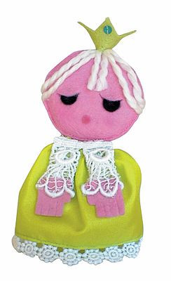A királylány ujjbáb arca és kezei rózsaszínek, ruhája és koronája zöldes-sárga. Haja fehér színű fonal. Az ujjbábok mérete általánosságban kb. 12,5 cm.