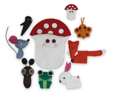 A gomba alatt ujjbábkészlet tartalma 6 db ujjbáb: pillangó, egér, nyuszi, madárka, róka és béka, illetve 1 db kesztyűbáb gyermek kézre: gomba. Az ujjbábok mérete általánosságban kb. 12,5 cm.