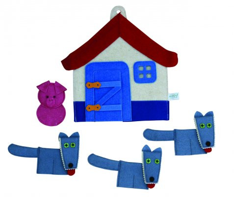 A Kismalac és a farkasok ujjbábkészlet tartalma 5 db ujjbáb: három farkas, malac és ház. Az ujjbábok mérete általánosságban kb. 12,5 cm.